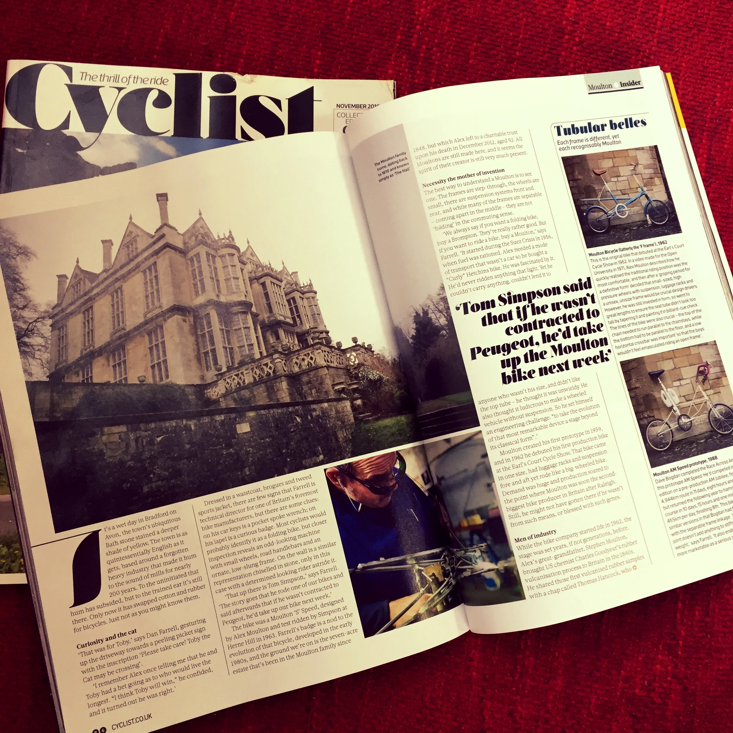 The current issue of Cyclist magazine has an eight-page article about the Moulton Bicycle Company. Favourite quote: “Tom Simpson said that if he wasn’t contracted to Peugeot, he’d take up the Moulton bike next week.” cyclistmag.co.uk