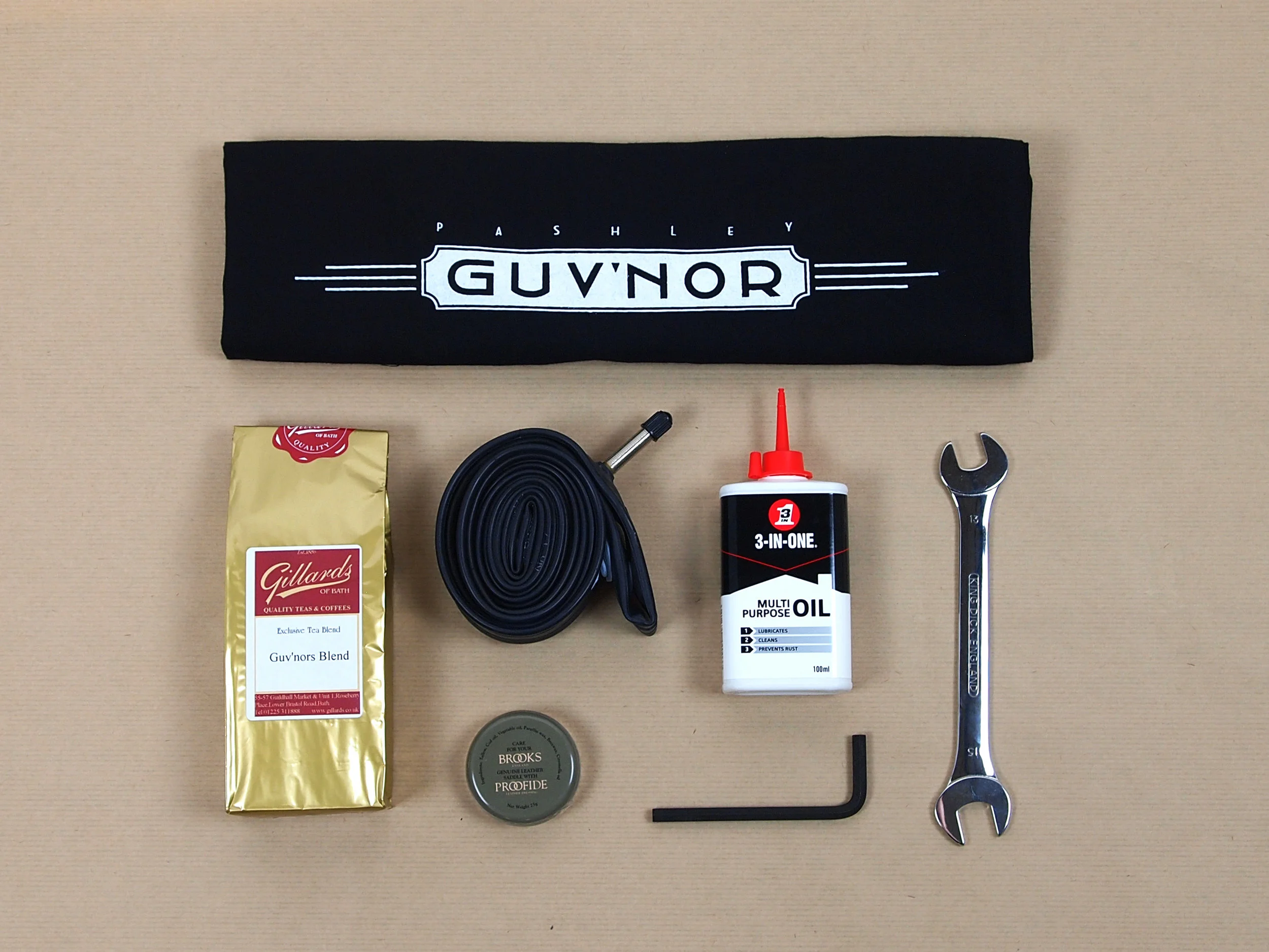 Guvnor musette in black to match the frame, a handy spare inner tube to take on a ride, a tin of Brooks Proofide to help keep the saddle in perfect condition, a King Dick spanner in 13mm & 15mm to tighten up the pedals and readjust saddle positioning and height, 6mm hex key to adjust the stem height and handlebar angle, a useful bottle of 3 in 1 oil to make sure everything runs smoothly and finally a packet of Guvnor loose leaf tea made especially for Pashley by Gillards of Bath so you can enjoy a lovely cup of tea after a long ride.