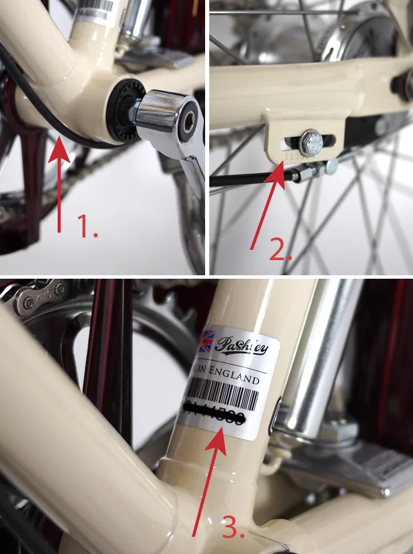 Every Pashley cycle has its own unique frame and serial numbers. These numbers help to identify each bike, and should be noted down for insurance purposes. Both numbers appear on the guarantee card that you received with your cycle. They can also be found on the cycle frame: the frame number is either stamped into a plate that forms the mount for the rear hub-brake arm on the left chainstay (the non-drive side - see 2), or under the bottom bracket (where the peddle crank-shaft is held - see 1); the serial number can be found on the security label affixed low down on the seat tube (the security label also displays the barcode unique to your cycle, plus a Union Jack).